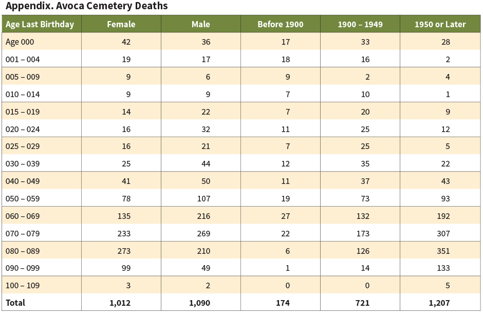 The Appendix provides the Avoca Cemetery’s age last birthday distributions at death for readable gravestones with complete birth/death information. These distributions were used to develop graphs 1 and 2.