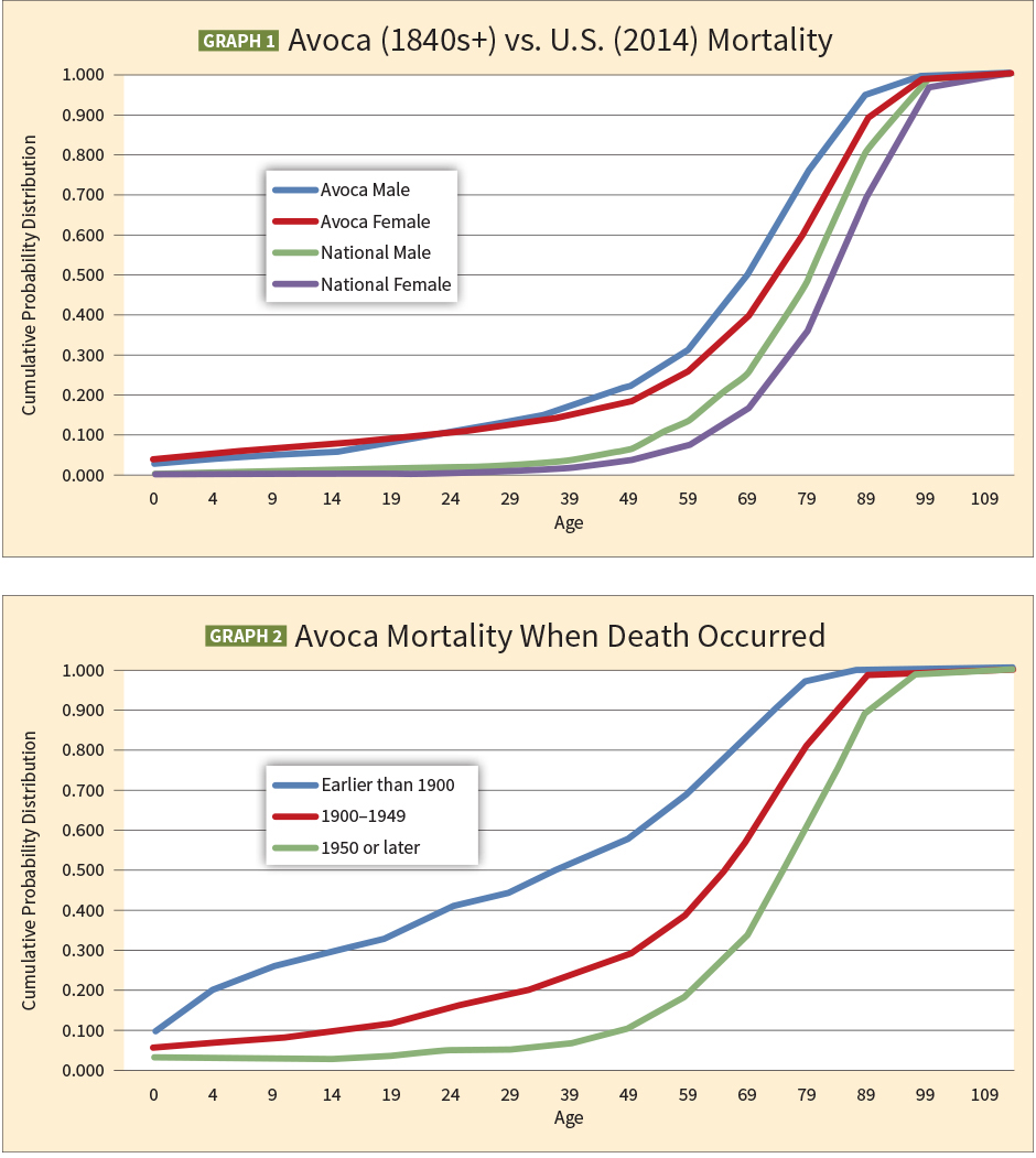 I compared Avoca Cemetery’s cumulative probability distribution for death (i.e., mortality) to that of the current national mortality distribution in Graph 1. Avoca’s mortality excluded the graves of unknown gender. As expected, Avoca Cemetery males died at younger ages than females (except under age 20) and both died at younger ages than current national mortality levels. Current national mortality came from the Social Security Administration’s 2014 mortality distribution.