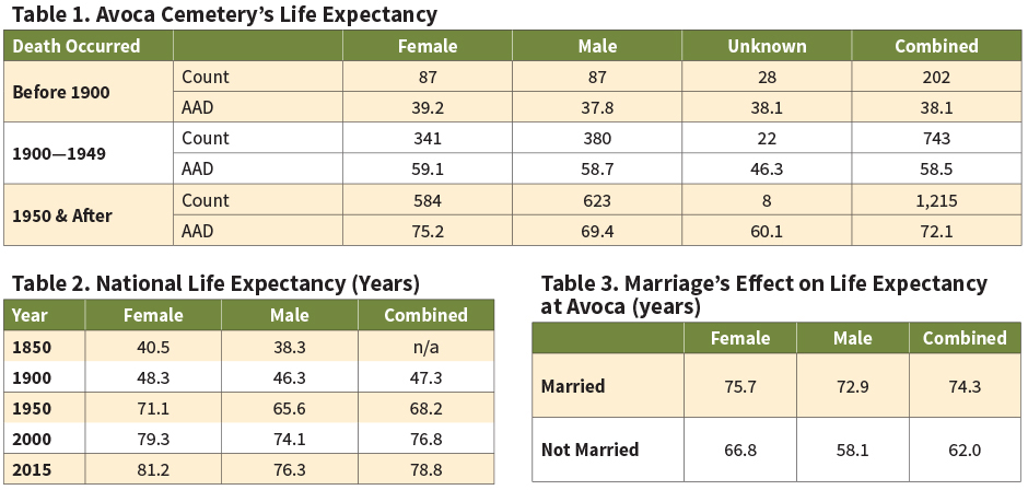 The life expectancies at the Avoca Cemetery were in line with national amounts for all time periods except those who died before 1900. For those dying before 1900, Avoca’s life expectancies were slightly below the national average for 1850, and we might have expected them to be between the 1850 and 1900 national life expectancies. I speculate there were two reasons for this trend: First, the sample size for Avoca was very small (about 170 people), so non-randomness occurred; and second, there might have been epidemiological reasons, beyond the scope of this article, that could have caused central Wisconsin to have worse mortality than Massachusetts (the source for the 1850 “national” life expectancy).