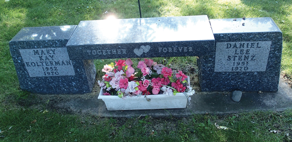 The emotion I most connect with cemeteries is sadness. For me, sadness was most apparent in Avoca with the many gravestones for infants who died at birth and two particular graves. These gravestones were nearly cube-shaped, connected by a stone bridge between them. I was curious about these graves because they were teenagers who both died in 1970, according to the gravestones. The graves were for Mary Kay Kolterman and Daniel Lee Stenz. A news article and their obituaries published in the Fond du Lac Reporter the day after their deaths explained that Kolterman was born April 23, 1952, and Stenz on Dec. 26, 1951. They were in a car accident and died within hours of each other on Dec. 29, 1970. The front-page article began, “Two area teen-agers [in the same car] were killed in a two-car crash at County Trunks Y and F, about one mile south of Oakfield, late Tuesday afternoon.” Stenz was 19 and Kolterman was 18; both were in college. According to my sister-in-law Joan Gau’s recollections, Kolterman and Stenz met in high school, had been engaged, and were looking for a reception hall at the time of the accident. Written on the bridge between their gravestones was: “Together Forever” with linked hearts. From readable gravestones, there were about 60 infants who died at birth. For example, Lucille Warnke’s (1896-1937) gravestone gave her name “And Infant Son 1937.” That probably meant that she died while giving birth along with her unnamed son.
