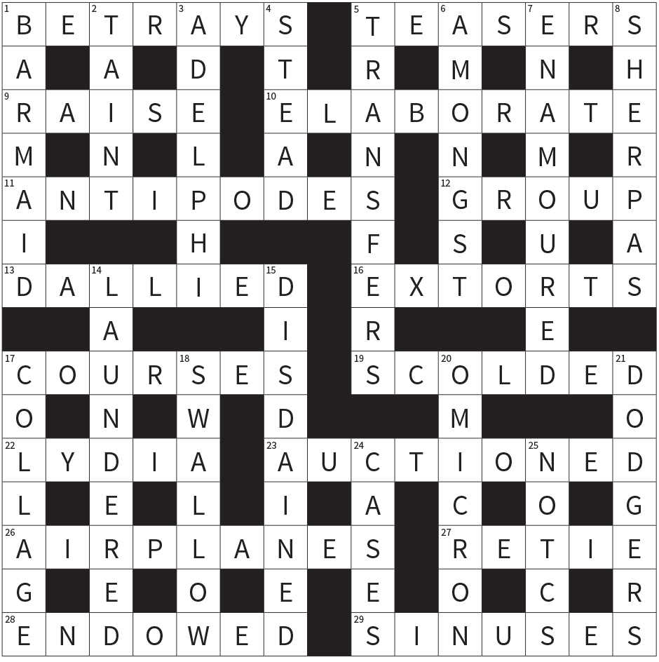 I had to make a major philosophical decision this time, namely whether to punish anyone who didn’t get Adelphi, a Long Island university of 7,859 students, named a 2010 Best College in the Northeast by The Princeton Review and ranked #146 among national universities by U. S. News and World Report. Okay, it’s not as well known as Hogwarts, but it’s not an obscure school. The crossing letters gave you A _ E _ P _ I, and the wordplay was “in the City of Brotherly Love,” so I “punished” Deb Edwards by leaving her off this issue’s list. It’s a tight ship we run around here, Deb.